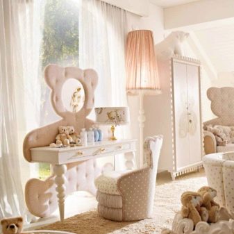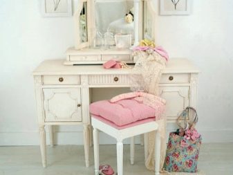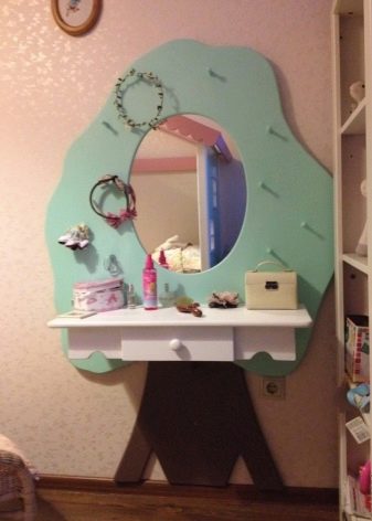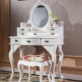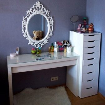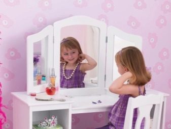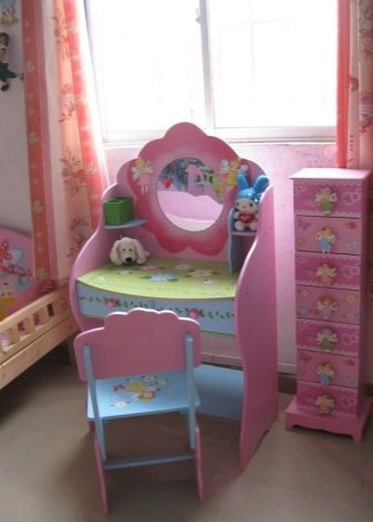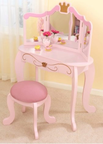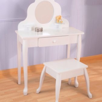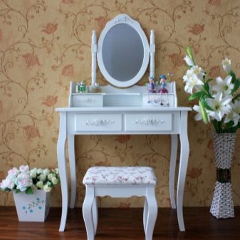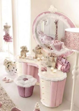 В стаята на възрастни момичета мебелите служат като функционален елемент, осигуряват съхранение на козметични аксесоари, парфюми и бижутерия. В детската стая масата изпълнява игрална роля, участва директно в сюжетни игри. Този вид забавление е важно за развитието на детето. Можете също така да рисувате и да правите други творчески дейности на масата..