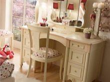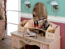 Детската маса не е акцентът на стаята. Мебелите за деца имат прости форми, но ярки дизайни с цветни рисунки. Трябва да се помни, че ученичките до 12-14 години са доста готини по темата за красотата и не се стремят да използват козметика. Но в юношеството момичетата започват да се интересуват от козметика – това означава, че те ще се нуждаят от маса, вече не такова дете и играчка, а просторна и възрастна.