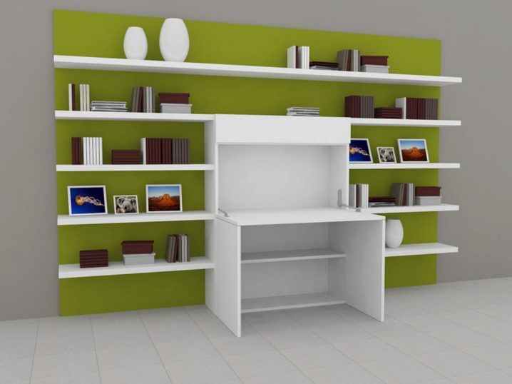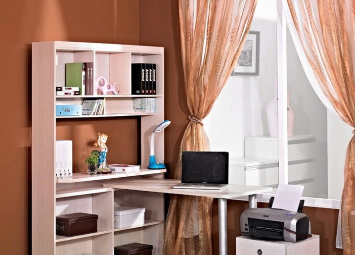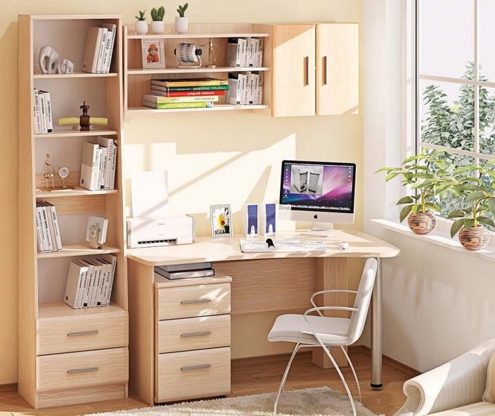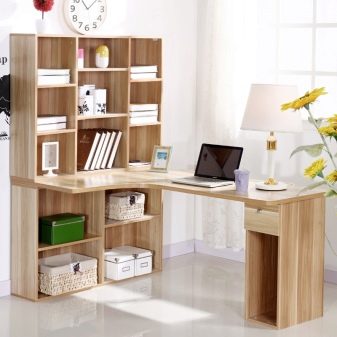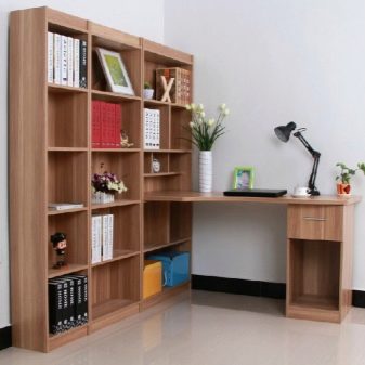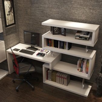 Компютърно бюро, комбинирано с рафтове, е идеално за организиране на място за работа и учене у дома. Големите маси могат да заменят отделна библиотека. По -малки маси с рафтове могат да се използват за съхранение на основни книги и справочници до компютъра.