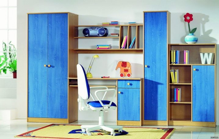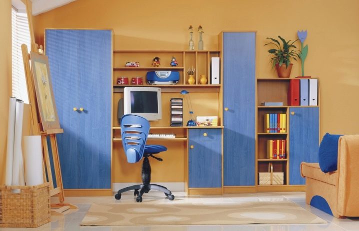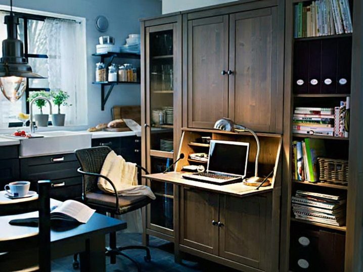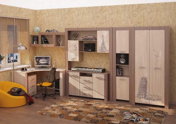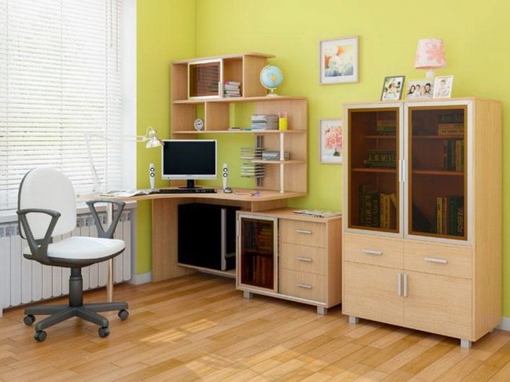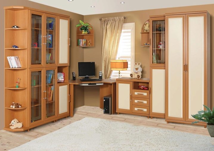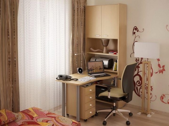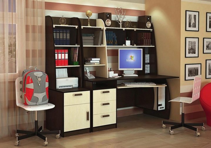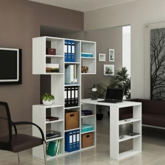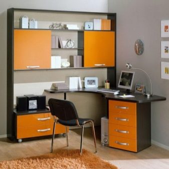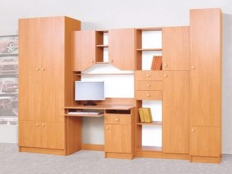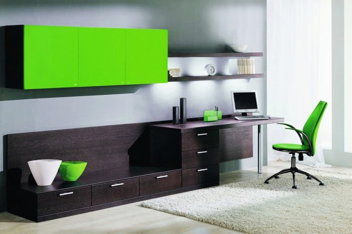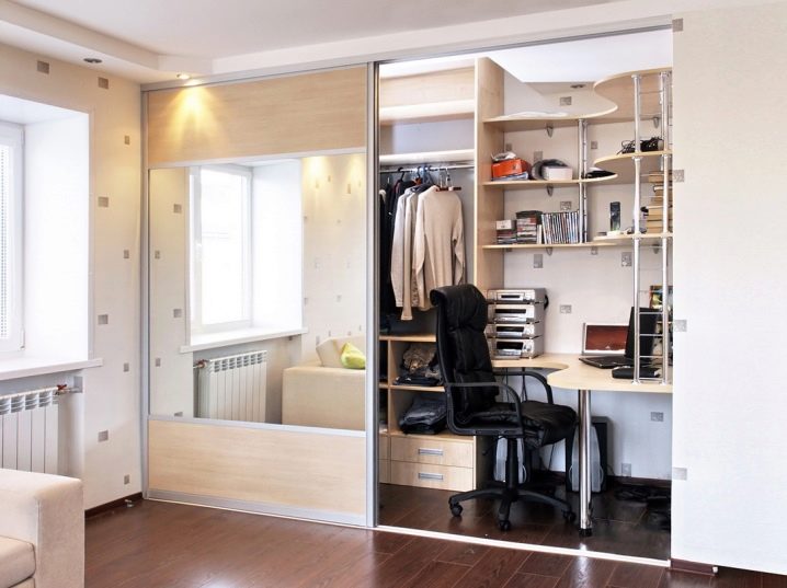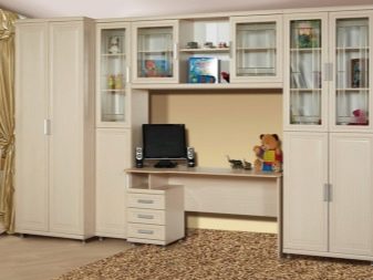 Понякога модулните слушалки комбинират в един елемент не само работно място, но и гардероб. Въпреки че на пръв поглед това разделение изглежда необичайно, това не е напълно вярно. Редица шкафове отделят компютърното бюро от останалата част на стаята, създавайки работна зона. Смята се, че ясното зониране на помещението помага значително в процеса на работа или отпускане, тъй като се развива условен рефлекс.