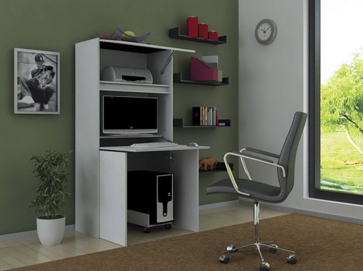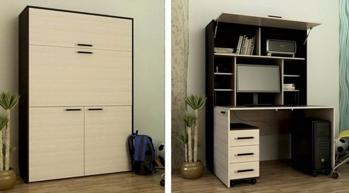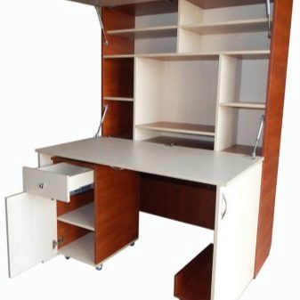 В допълнение към стационарни компютърни маси, комбинирани с гардероб, има сгъваеми и издърпващи се мебели. Те могат да бъдат обикновен шкаф, където работната конзола е скрита. Въпреки това, с едно движение на ръката ви е лесно да разширите работния панел и да го превърнете в бюро или място за работа на вашия компютър..