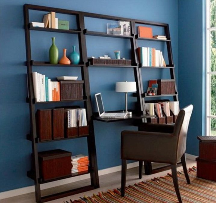 Необичайно компютърно бюро под формата на стълба, комбинирано с рафтове, ще се хареса на любителите на модерността и необикновените мебели. Въпреки че външно моделът изглежда нестабилен, това съвсем не е така, тъй като рафтовете му са прикрепени директно към стената. Те са много тесни, така че правят гардероба по-скоро отлична декорация за всяка стая, отколкото пълноценно работно място. Моделът е изработен от представим тъмно дърво, което изглежда особено шикозно в комбинация с кожено кресло и керамични вази в контрастни цветове.