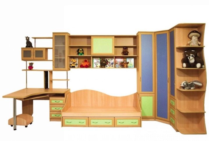 - Комплекс, който съчетава всички зони на детската стая: за почивка, за сън и за съхранение. Структурата заема много място, но ако може да бъде позиционирана по стената, тогава други мебели изобщо няма да са необходими. Мебелите са изработени от естествено дърво с използване на метални и пластмасови части. Цветовата схема е достатъчно спокойна и не може да отвлече вниманието от работата.