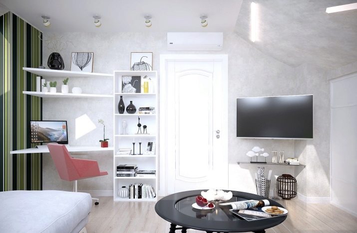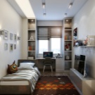 - Интересно решение за малка стая под формата на перваза на прозореца. Работната зона, която се основава на линеен плот до прозореца, има функционални допълнения под формата на странични маси на колела и стенни шкафове. Интериорът е завършен в сиво с няколко смели акцента и е идеален за тийнейджър.