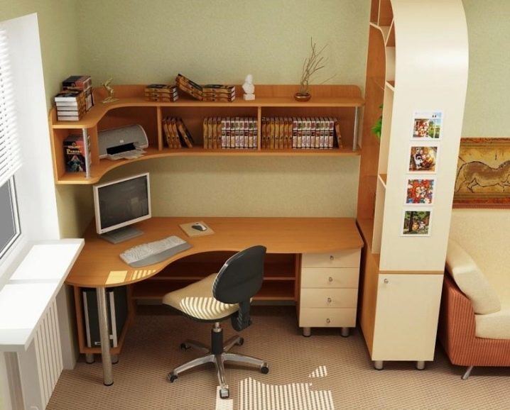 Компютърното бюро е неразделна част от работната зона. Има няколко вида този дизайн: класически, ъглов, модулен, трансформатор, който включва не само маса, стол, но и гардероб и легло.