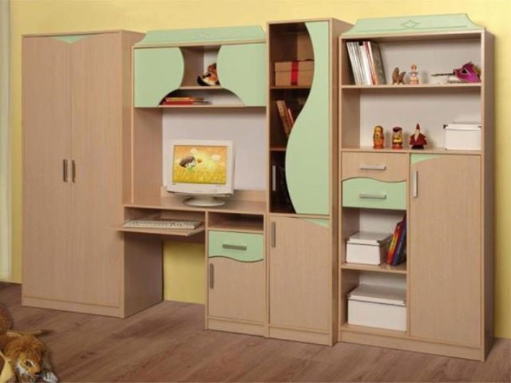 - Модулна версия на компютърно бюро, което има достатъчно място за поставяне на компютър, както и гардероб и стена за книги и учебни пособия. Дизайнът е направен в класически цвят и има няколко пластмасови панели в цвят шам -фъстък.