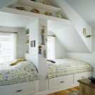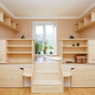Бебешките креватчета са разположени под подиума, спестявайки площта на стаята през деня и се изнесат под подиума по време на сън.