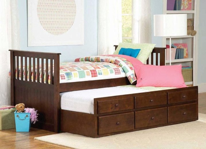 Моделите сгънати легла с разтегателна система практически не се различават от обикновените мебели за спане. Единствената разлика е, че те са малко по -високи от класическите аналози. Второто легло се извежда с помощта на специален механизъм. Той е оборудван с колела, които улесняват разгъването на втората част, дори дете може да се справи с тази задача.