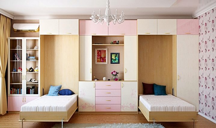 Детските сгъваеми или повдигащи се легла са вградени в гардероба. Това е най -добрият вариант за малка стая, в която живеят две деца. През деня, когато леглото е повдигнато и скрито в килера, има много свободно пространство. С настъпването на нощта тези ясли се сгъват назад и образуват две свободно стоящи места.