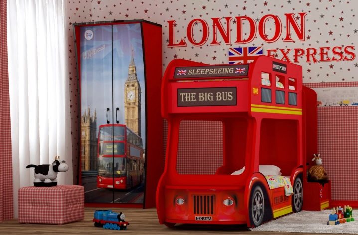 Ако децата ви активно учат английски, двуетажно легло, направено под формата на двуетажен автобус, може да бъде изключително решение. Стените в стаята могат да бъдат украсени с фотоапарати, изобразяващи забележителностите на Лондон. Можете също да закачите в стаята снимки на известни личности с техните цитати на английски.