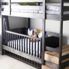 Рамката и основата на това легло са изработени от естествено дърво. В този случай това е масивен бук, който се обработва със специални средства за най -висока безопасност и издръжливост. Разликата между този модел е наличието на подвижен страничен панел, което е много удобно, ако същите мебели ще бъдат използвани за спане от по -голямо дете..