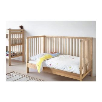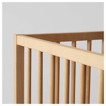 Този модел е изработен от бреза и е покрит с нетоксичен акрилен лак. Много е удобно, че дъното на яслите може да се повдигне и спусне до желаното ниво. Възможно е също така да се премахне един страничен панел на решетката и вместо това да се постави специална броня. Изборът на такива аксесоари в Ikea е разнообразен..