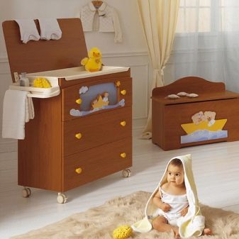 Цената на такива мебели се различава значително от обикновените сменящи се дъски. Ето защо бъдещите бащи често се опитват предварително да направят удобни, многофункционални, размерни и компактни мебели със собствените си ръце. Често чекмеджетата на скрина са украсени с рисунки или шарки..