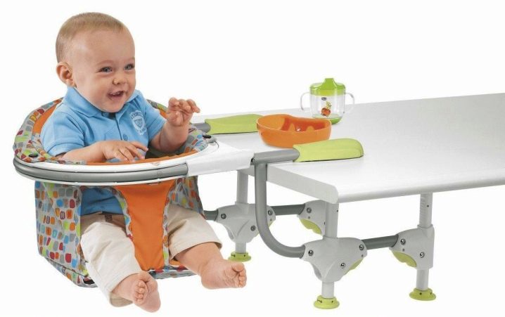 Висящият стол е фиксиран на обикновена маса за хранене. В този случай плотът трябва да е много стабилен. Тази версия на стола има ограничение на теглото и е предназначена за деца под една година..