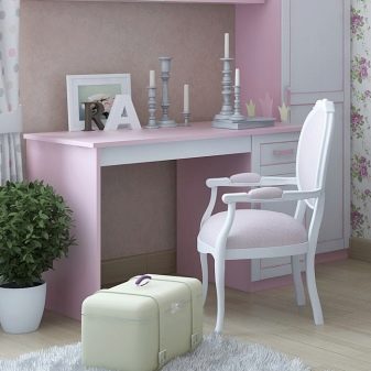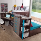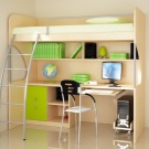 Ако пространството на детската стая е ограничено, можете да закупите легло с маса, този модел се нарича още легло на таванско помещение. Горе има място за спане с легло, а отдолу има работно пространство с бюро и допълнителни елементи под формата на чекмеджета и рафтове.