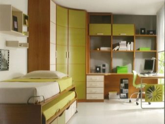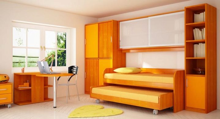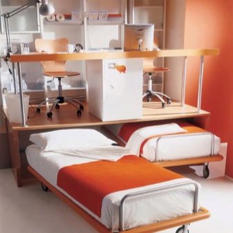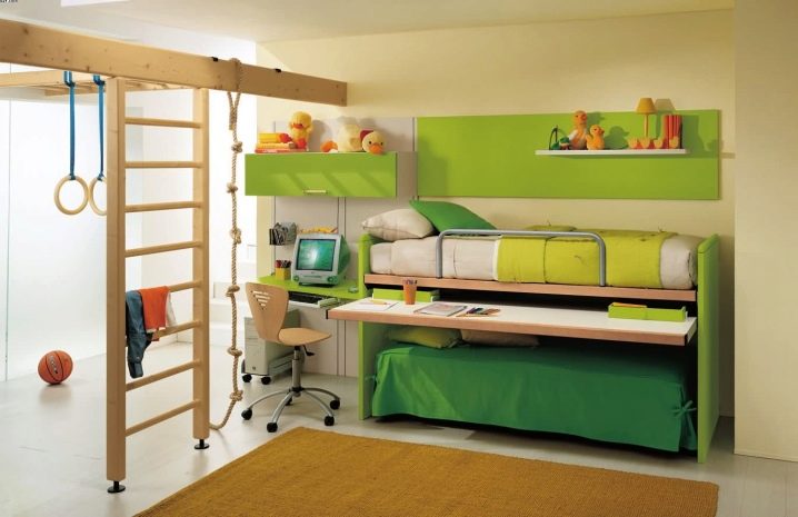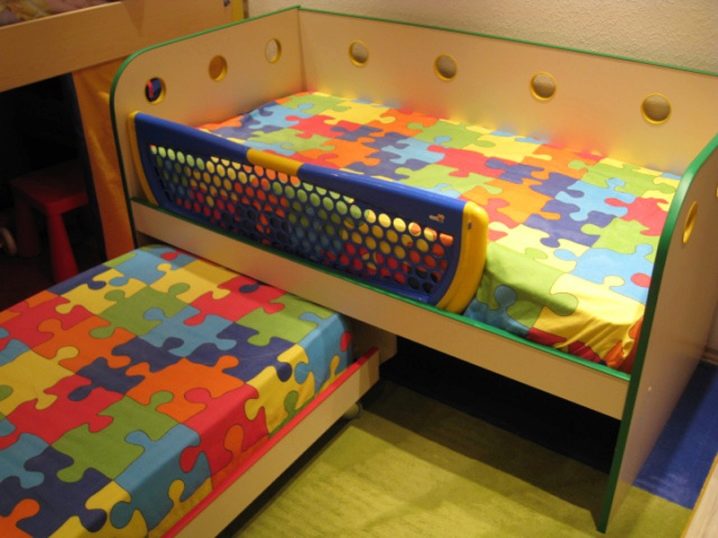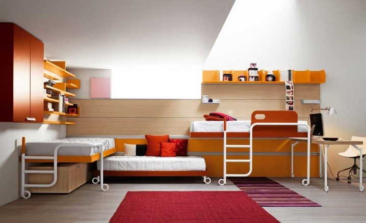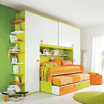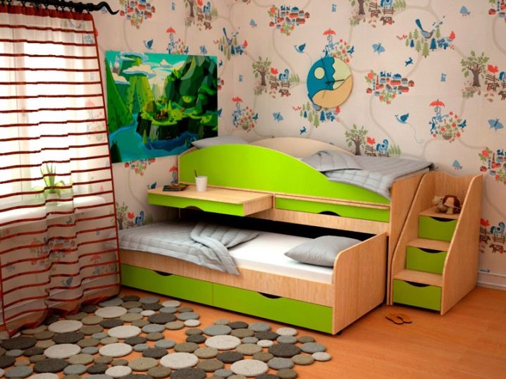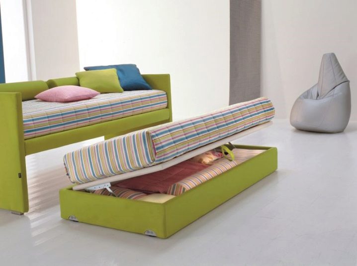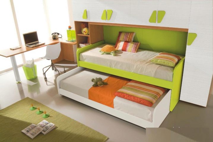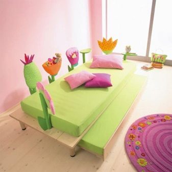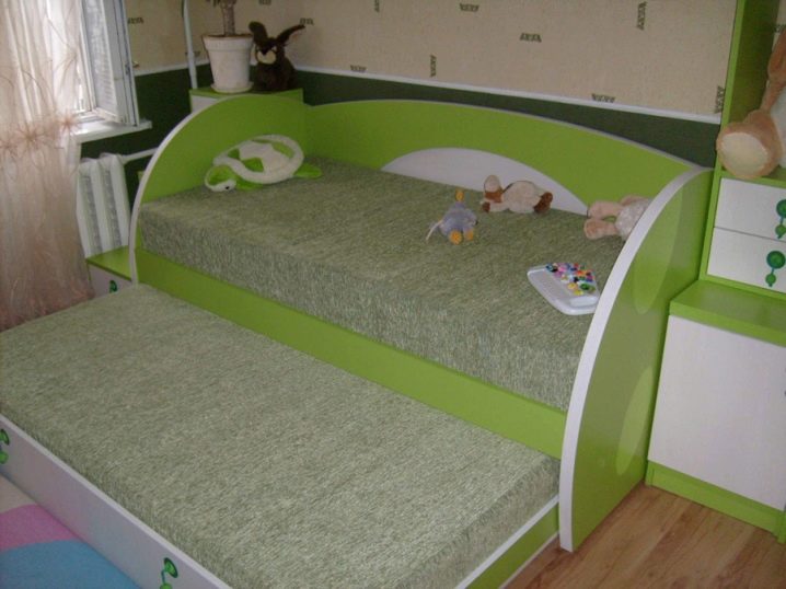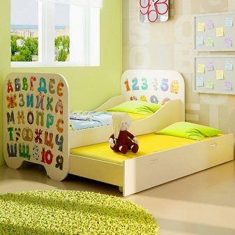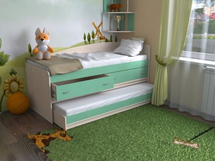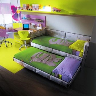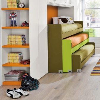 - Ергономичност, практичност. Тези модели няма да заемат много място в детската стая. Разтегателното легло е проектирано да спести значително място, да го предпази от претрупване. През деня децата ще могат да играят свободно, включително на дивана, а вечер и двете бебета ще се поберат на детските креватчета, които ще бъдат разположени едно до друго.