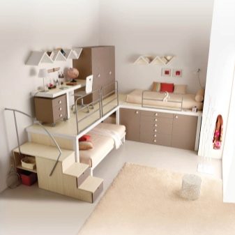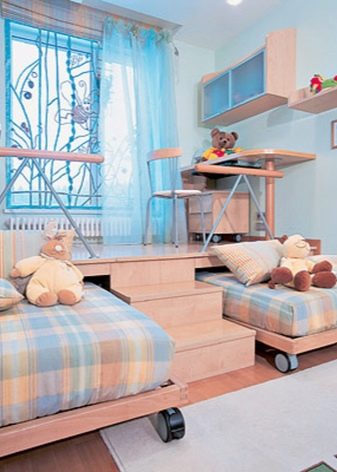 Този модел е представен от специален дизайн, който има легла, които се изнасят от подиума. По този начин подиумът ще бъде специфична зона от стаята: или игралната, или учебната зона. Малките ще имат достатъчно място за игра през деня. Също така в основата могат да бъдат разположени шкафове за спално бельо и играчки, книги и други неща..