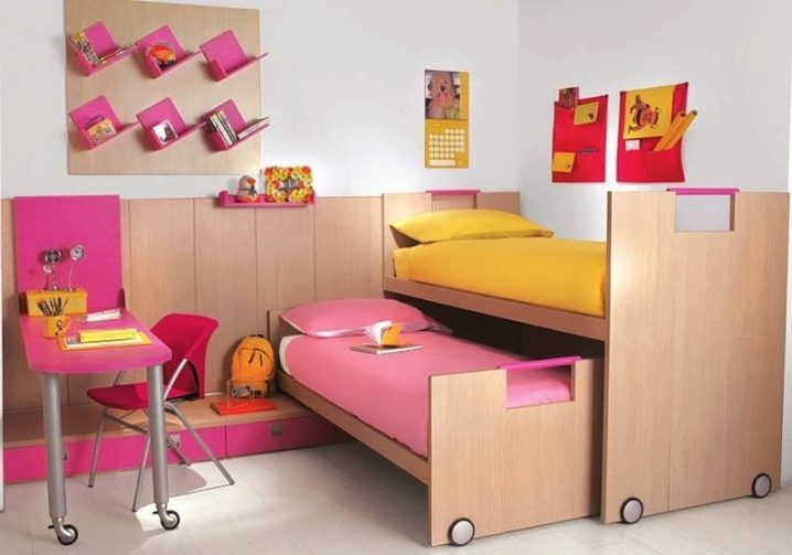 Украсете стаята в розови или прасковени цветове, като използвате оригиналния интериор. Нека момичетата усетят грижите и вниманието от родителите си.