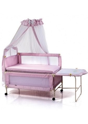 - Плъзгаща се метална конструкция. Той е напълно оборудван, от балдахин до допълнително бебешко креватче.