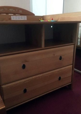 - Лексвик е пелена, разположена на горния капак на скрина. Този скрин е на доста високи удобни крака и в допълнение към масата за преобличане има няколко издърпващи се чекмеджета и рафт. Такъв дизайн, според отзивите на клиентите, е удобен, оборудван е с просторна пелена, която, както пишат майките, е удобна дори за по -голямо дете..