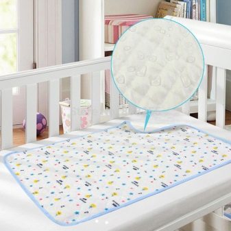 - Двустранната кърпа и матрачната кърпа са идеални за всяка майка. Едната страна на тази дреха е изработена от водоустойчив материал, а другата е покрита със слой от приятна памучна материя с ярък печат. Такава кърпа може да има ластик и да бъде прикрепена към матрака..