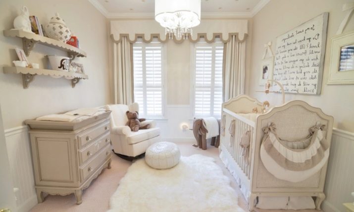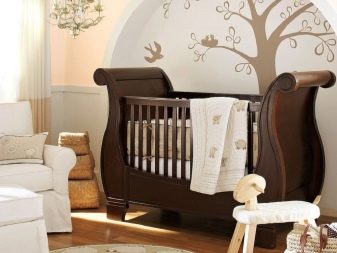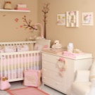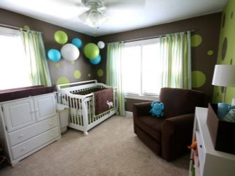 Стая с кафяво покритие е идеална за светли мебели. Текстилът може да бъде кафяв или бял, кремав, бежов. Комбинацията от розови и ментови зелени нюанси в декора на леглото и стените ще изглежда много оригинална. В такава стая ще бъде удобно не само за бебето, но и за майка му. Тази успокояваща среда ще помогне на уморена майка да се отпусне и да успокои нервната си система..