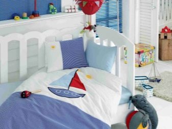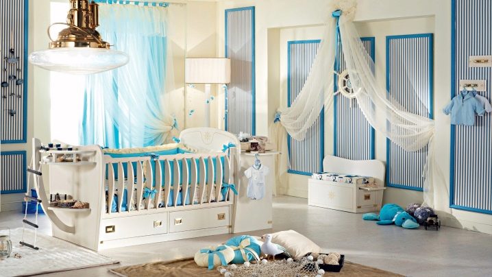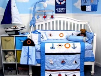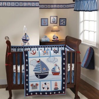 Декоративните елементи под формата на корабно колело, делфини, капки вода ще изглеждат много актуални. Висококачественият текстил не само допълва цялото великолепие на този дизайн, но и добавя реализъм към него. Благодарение на висококачествените завеси можете да създадете илюзията за вълни, а комплектът за легло ще ви помогне да завършите „кабината“ на капитана и да създадете уют в нея..