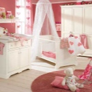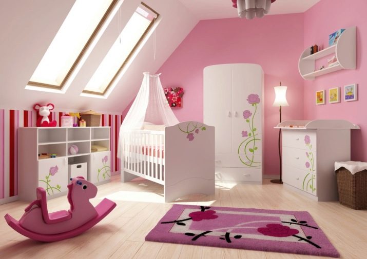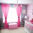 Розовият цвят в интериора на детската стая сякаш крещи, че това е стаята на малка, палава фея. Използвайки розово, можете да създадете усещането, че сте на пухкав розов облак. Ако стените на стаята са направени в розово, тогава не трябва да злоупотребявате с нейното изобилие. Мебелите в такава стая трябва да са много спокойни, да балансират и разреждат яркостта на стаята, затова е по -добре да изберете бяла или светло кремава слушалка..