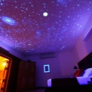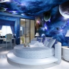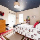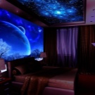 - Някои магазини предлагат тапети с ефект „звездно небе“ за тавана. Като правило те са направени в по -тъмен вариант от стените – в синьо или черно. Тези тапети изглеждат добре в стая с високи тавани. Максималният ефект от такъв тапет ще бъде постигнат, ако има скрито осветление по целия периметър на стаята..