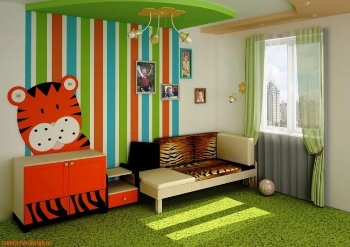 Друг вариант е тапет с орнамент. Ивиците са най -добрият избор – това е неутрален модел, който ще подхожда на всяка възраст. Възможно е да се комбинират ивици с обикновен тапет, основното е да се спазва комбинацията от нюанси. Особеността на раирания тапет е способността му да коригира визуално пропорциите на помещението – вертикалните ивици ще направят стаята по -висока, а хоризонталните – по -широки.