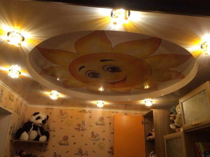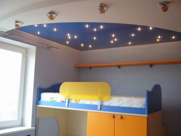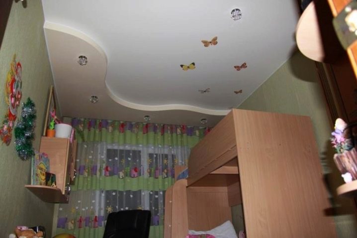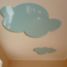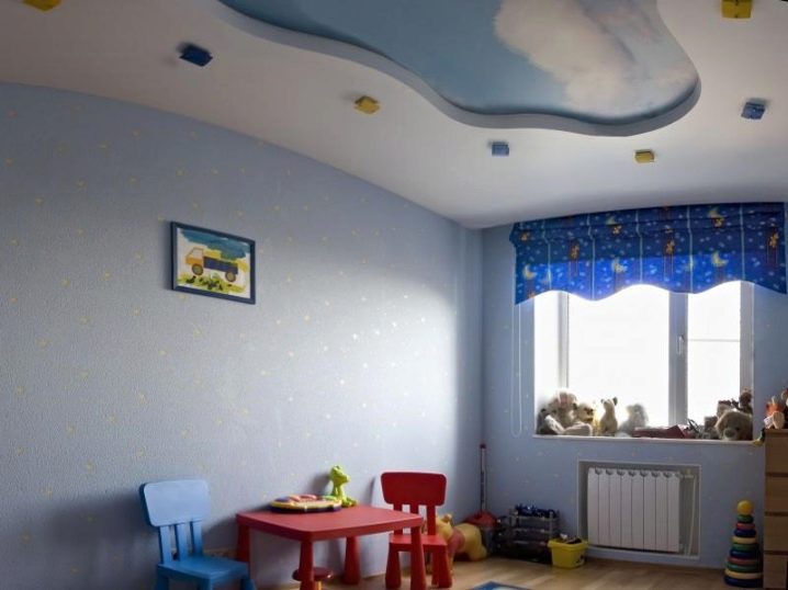 За детска стая можете да изберете опънати или окачени тавани. Най -често родителите избират фалшив таван, т.к той е изработен от естествени материали.