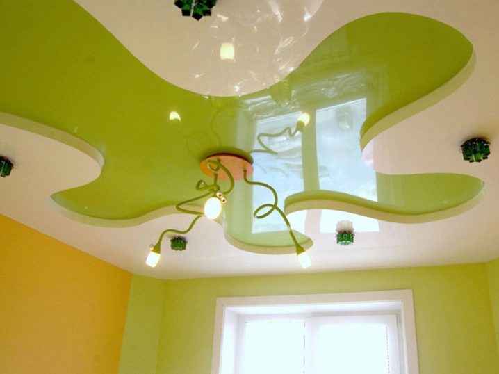 Ако детската стая е голяма, тогава таванът над зоната за игра може да бъде направен в наситен цвят. В този случай е по -добре да украсите зоната за отдих в спокойни цветове..