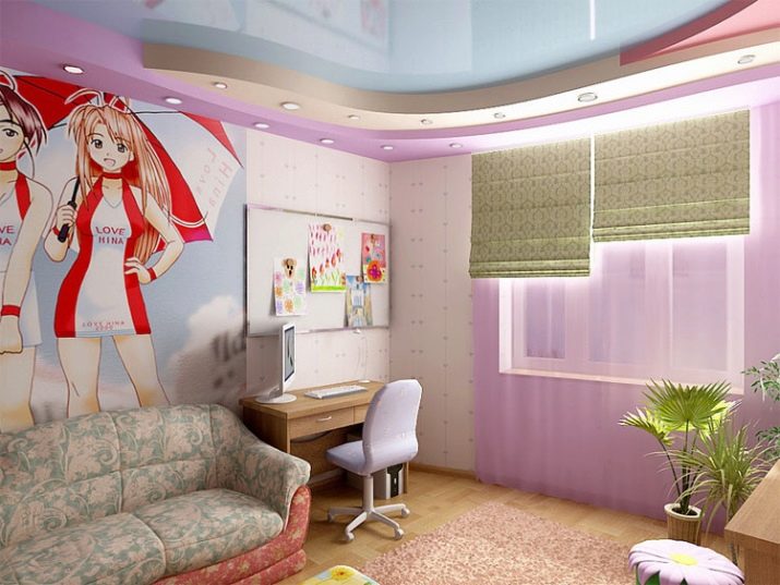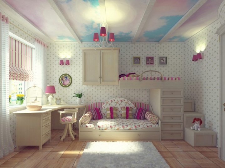 Като се има предвид, че говорим за довършване на тавана за стаята на момичето, тогава ако изберете розово като допълнителен цвят, няма да сбъркате. Бледо лилавите нюанси или светлосиньото също изглеждат красиви..