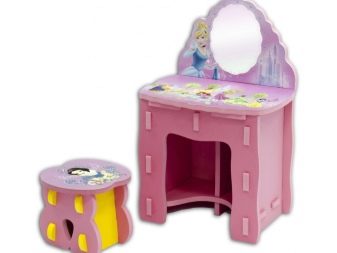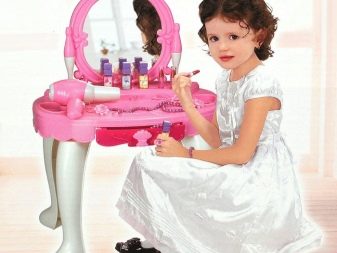 За момичета в продължение на 5 години е по -добре да закупите модел с бордюр, чекмеджета със безопасни крепежни елементи. Те могат да се използват за съхранение на фиби, еластични ленти, обръчи, маски за играчки и бебешка козметика. До масата можете да поставите дървен стол или тахта, направени в същия дизайн като самата конструкция. Предучилищната възраст е време на нови открития и интереси. Вече не е толкова страшно да подарите малко червило за красота, сенки или четки за грим в ръцете на малка красавица..