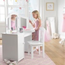 Такъв интериорен детайл, за разлика от масата за възрастни, не действа като стилистичен или цветен акцент. Тя обаче може да внесе специално настроение в стаята на момичето. Миниатюрна дървена маса за грим за вашата принцеса ще бъде част от нейните забавни игри в козметичния салон, гримьорното студио и т.н. Дъщерите толкова обичат да подражават на майките си, затова е разумно да подредите отделна маса за вашето дете с необходимите аксесоари. така ще осигурите “нападения” в чантата, шкафа си с козметика.