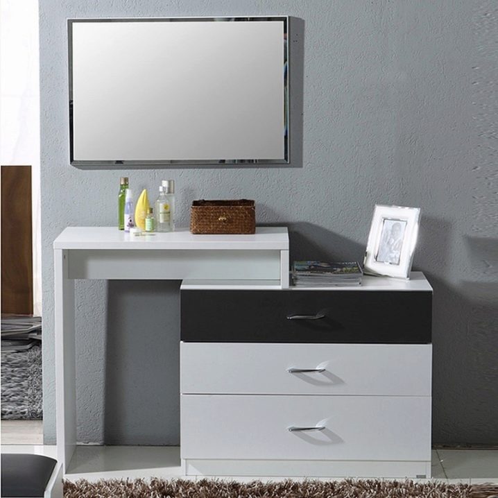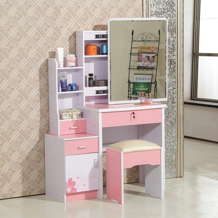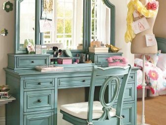 По -положителни ще бъдат дървените конструкции, боядисани с дъгова палитра, с винилови стикери на хипи, дискотека или изтъркани шик посоки. Не се закачайте за броя на чекмеджетата и височината на масата. Основното е да разпределите правилно функционалните зони: огледало, молив с бижута, кутия с мъниста, отделение за козметика, шапки, обувки и т.н..
