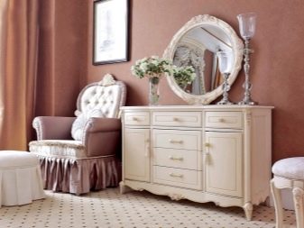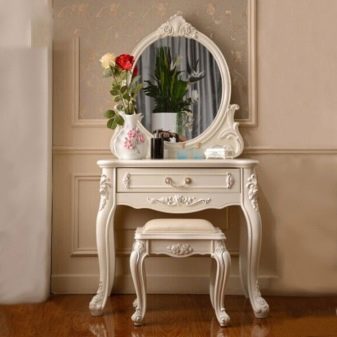 За сдържан лаконичен интериор са подходящи високотехнологични модели на пиедестали, скринове и маси. Гладките линии, наличието на чекмеджета, врати, практичността при използване на всеки елемент са основните характеристики на съвременните тоалетки. За реколта, изтъркан шик декор е по -добре да погледнете дървени конструкции с ефект на стареене. Деликатни нюанси, столче за хранене с пухкава пола, флорални шарки ще украсят малка детска маса за игри и грим. Подкрепете детето си в усилията му да се опита да бъде красиво и модерно