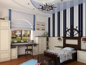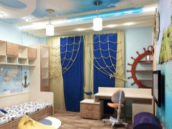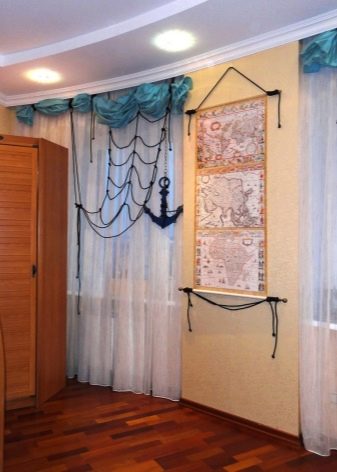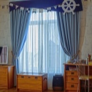 Като правило, децата в морски стил се изпълняват за момчета. В крайна сметка те са тези, които мечтаят за пътуване, приключения и си представят себе си като смел капитан или, напротив, като пират. За тях можете да направите завеси под формата на платна, ако зоната на детската стая позволява.. Въжената завеса също ще изглежда добре.. Като цяло всякакви завеси в сини и сини „момчешки“ тонове органично ще се впишат в детската стая на момче.