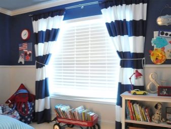 Ако изглежда, че обикновените завеси в детската стая ще изглеждат скучни или твърде ярки, използвайте лента. Синьо -белите хоризонтални ивици символизират жилетки и ще бъдат подходящи за морски дизайн. Тяхното предимство е също така, че визуално могат да разширят стаята.. Ще бъде добре да допълните отпечатъка върху завесите с подобен модел върху тапицерията на мебели, възглавници и други интериорни предмети. Не закачайте обаче завеси с тясна лента – такъв модел бързо ще умори зрението ви..