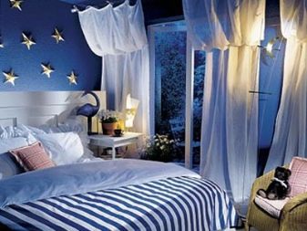 Всички нюанси на синьо (от светло синьо до тюркоазено), бежови и пясъчни цветове, слънчево жълто и нюанси на кафяво също ще определят морския стил на стаята. В същото време е важно цветът на завесите да съвпада или допълва цветовете, които вече са налични в интериора на стаята..
