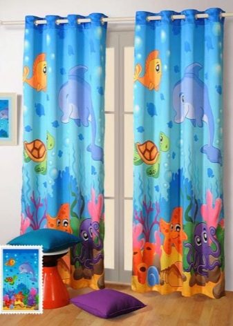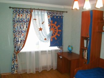 Понякога дете иска да проектира детска стая, впечатлено от конкретни герои в книги или карикатури. За такъв повод текстилните салони и магазини предлагат разнообразие от материи с принтиран морски стил. Можете да намерите завеси с прости черупки и платове за завеси с рисунки на анимационни герои от морска тематика.. В същото време се предлагат добри решения на придружаващи тъкани, можете да вземете леки завеси от органза и непрозрачни плътни завеси за втория ред със същия или подобен модел.