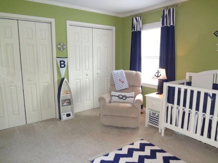 Първата асоциация, която идва на ум, е синьото. Всъщност в по -голямата част от случаите синьото присъства в интериори, направени в морски стил.. Синьото успокоява, успокоява и ви позволява да се съсредоточите. В същото време изобилието от синьо потиска настроението, дава усещане за студ. А тъмносините тонове визуално стесняват пространството.. Затова трябва безопасно да използвате богато синьо в просторни слънчеви ясли за активни деца. Във всички останали случаи синьото трябва да се използва умерено..