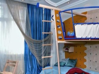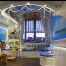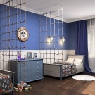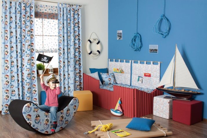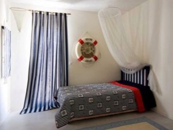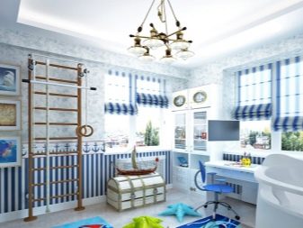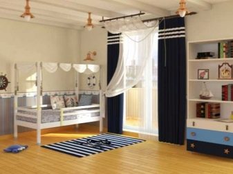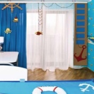 Като правило, децата в морски стил се изпълняват за момчета. В крайна сметка те са тези, които мечтаят за пътуване, приключения и си представят себе си като смел капитан или, напротив, като пират. За тях можете да направите завеси под формата на платна, ако зоната на детската стая позволява.. Въжената завеса също ще изглежда добре.. Като цяло всякакви завеси в сини и сини „момчешки“ тонове органично ще се впишат в детската стая на момче.