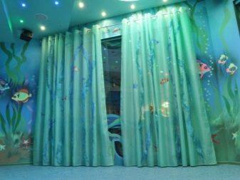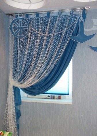 Понякога дете иска да проектира детска стая, впечатлено от конкретни герои в книги или карикатури. За такъв повод текстилните салони и магазини предлагат разнообразие от материи с принтиран морски стил. Можете да намерите завеси с прости черупки и платове за завеси с рисунки на анимационни герои от морска тематика.. В същото време се предлагат добри решения на придружаващи тъкани, можете да вземете леки завеси от органза и непрозрачни плътни завеси за втория ред със същия или подобен модел.