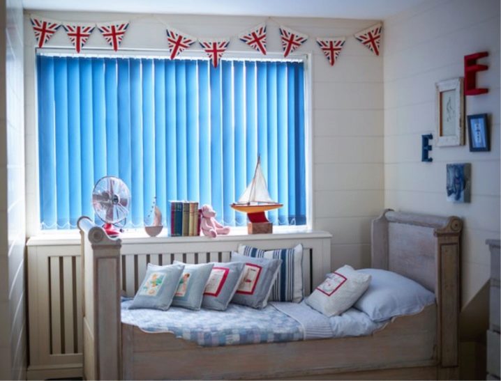 Морският стил се поддържа перфектно от обикновените щори на прозореца на детската стая.