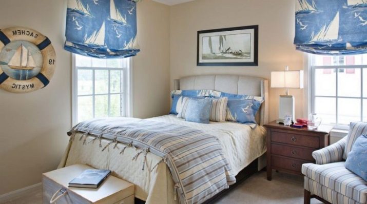 Всички нюанси на синьо (от светло синьо до тюркоазено), бежови и пясъчни цветове, слънчево жълто и нюанси на кафяво също ще определят морския стил на стаята. В същото време е важно цветът на завесите да съвпада или допълва цветовете, които вече са налични в интериора на стаята..