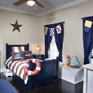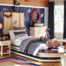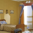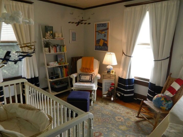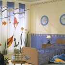 Трябва внимателно да обмислите избора на тъкани: препоръчително е те да са прахоустойчиви, тъй като детето най-вероятно ще докосне завесите. Също така, ако е възможно, трябва да изберете естествени материи – лен, юта, памук. Морската тема предполага използването на груби текстурирани тъкани, така че тук можете да комбинирате екологичността на материалите и естетиката на стаята..