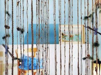 Вместо мрежа за риболов върху завесите, можете да направите нишки от въже, върху които са завързани възли и фиксирани черупки и морски звезди.