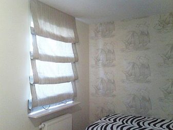 Не претоварвайте малка детска стая със сложен дизайн на завеси. В малките стаи по -подходяща ще бъде римска щора, която може да поддържа морския стил на стаята..