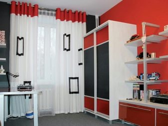 Ярките завеси в стила на минимализма са направени в неутрален бял тон. Червените акценти трансформират този модел, докато черните геометрични форми го правят млад и стилен..